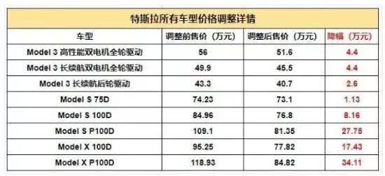 售价下调的包含Model S、Model X和Model 3共计8款车型的在华销售价格,其中,Model 3 降价幅度为2.6-4.4 万元、Model S 为1.13-27.75 万元、Model X 为17.45-34.11 万元。这是特斯拉进入中国市场以来进行的最大规模降价。