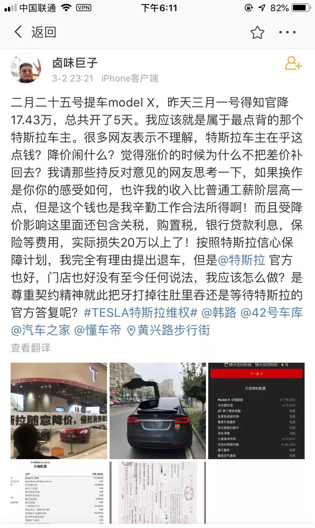 “2月份新买的特斯拉X,刚提车9天就降价,车牌还没上,就直接损失了20万元!”