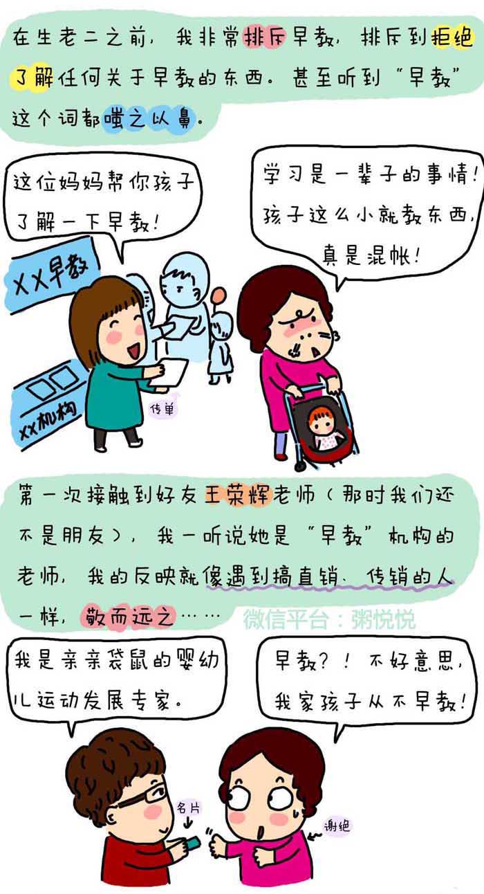 下面为大家分享的是著名漫画家粥悦悦对于早教的一些看法,在没上早教之前悦妈并不认可早教甚至有点抗拒,在遇到王荣辉老师时甚至因为她是做早教这个工作的而不愿与其教朋友,那么是什么原因让粥悦悦对早教从抗拒到主动去了解并全家参与呢?其实,答案就在本文中!