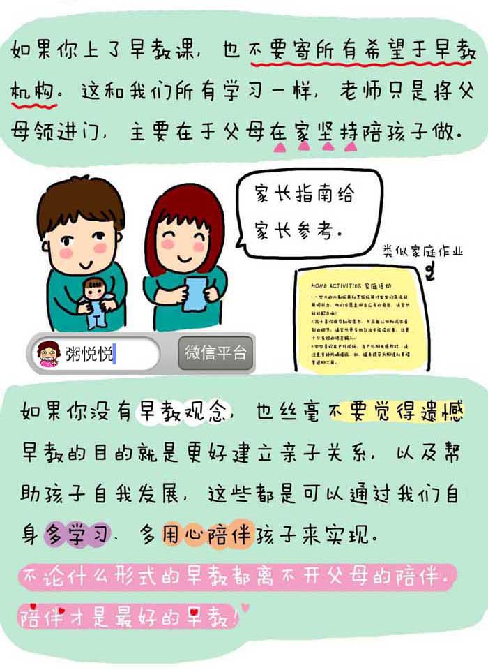 无能什么形式的早教,都离不开,也不应该离开父母的陪伴。脱离父母的早教,都是伪早教。不要让长辈及保姆来替代我们身为父母的角色(我就在早教中心见到妈妈一边玩手机,保姆上早教课的……),他们只是协助,无法替代父母。