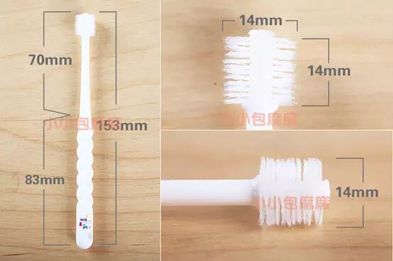 再来一个刷头的合集,其实给小宝宝买牙刷,最最重要的就是选择一款小刷头的牙刷,这个图片一目了然了,最小巧的前三名牙刷是是贝亲,Oral Care,巧虎,柔软程度相差无几。
