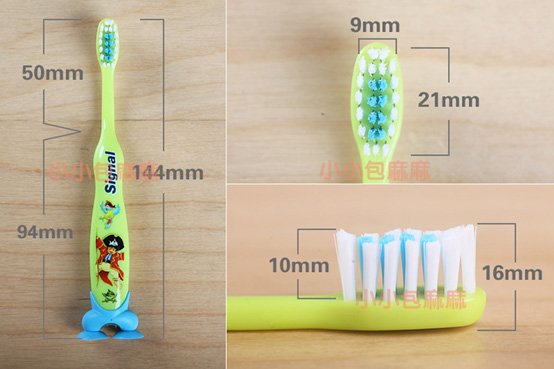 还有一个小细节signal牙刷的刷面是波浪形的,理论上对牙缝的清洁会更有效一点,但是针对小宝宝来说,这种设计个人感觉不一定好,单位时间内的接触面积可能会比较小