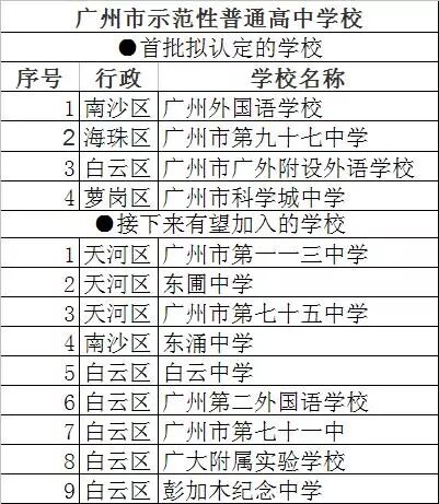 2017年,广州认定了首批4所广州市示范高中。这些高中从名气来说没有省示范性高中那么响亮,多半是后起之秀。