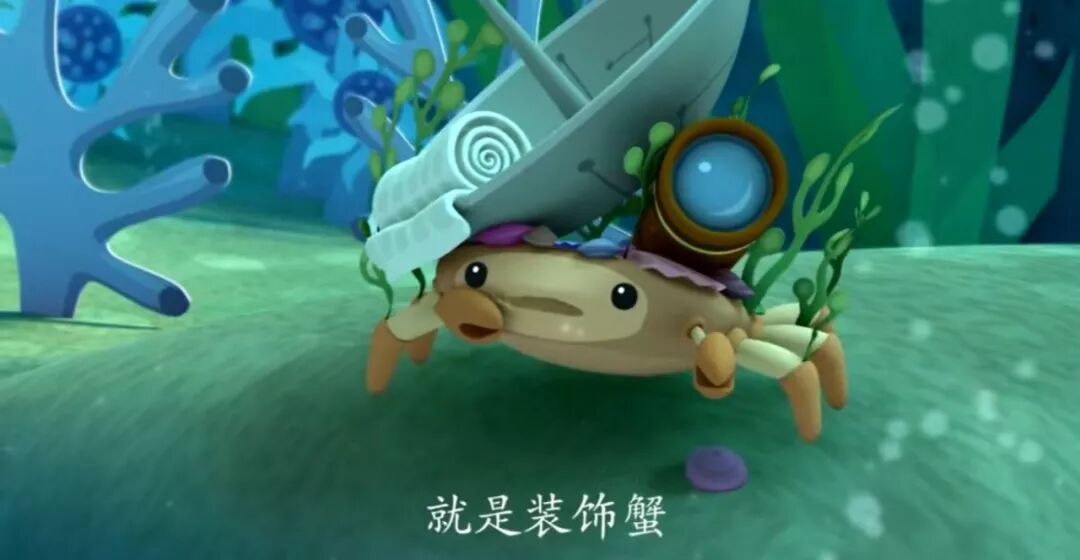 这一集的海洋故事我们会学习到一种新的海洋生物叫装饰蟹,它是海底世界里的伪装专家,它们把发现的物体粘在自己的壳上,用海草和一些很小的海洋生物形成了一个伪装层,这样它们就可躲避鲨鱼追捕了。