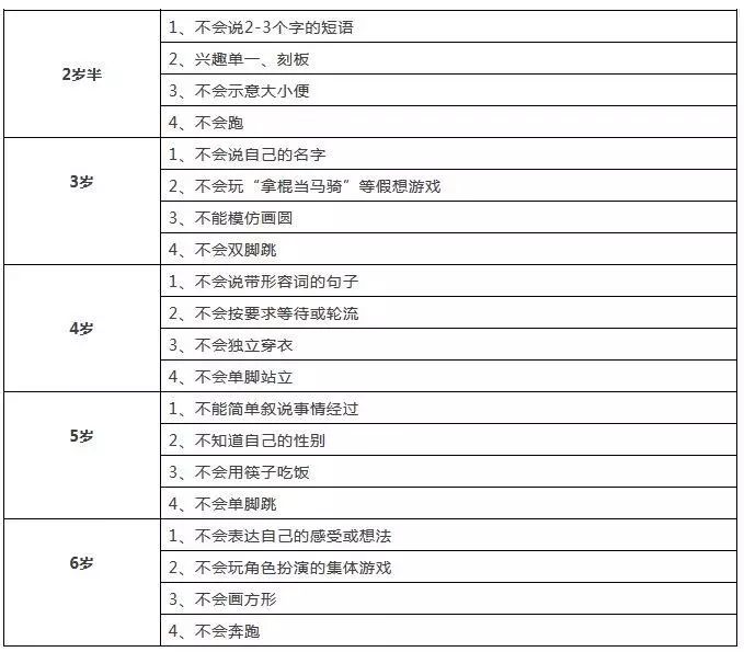 那么,如何判断孩子心理与行为发育是否良好呢?自闭症孩子有哪些症状呢?如何才能发现孩子有自闭症倾向? 不同月龄的孩子理应具有相应的能力,如3个月会抬头,6个月会扶坐等等,下表为预警征象,请宝爸宝妈对应参照,若孩子在相应月龄出现以下多种情况,请务必引起重视,及早诊治。