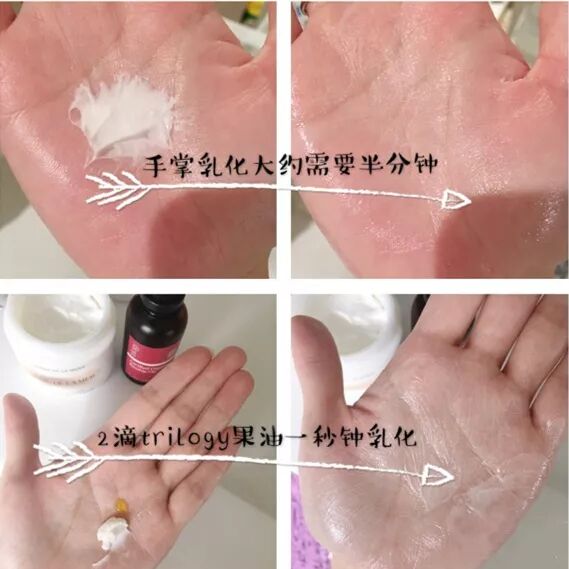 滴在面霜中,更加保湿,强大的修复能力给皮肤非常好的呵护。另外La mer经典面霜难乳化的问题在遇到trilogy果油之后一切都迎刃而解了,原本需要半分钟才能完成乳化,滴两滴trilogy果油真的一秒钟乳化!