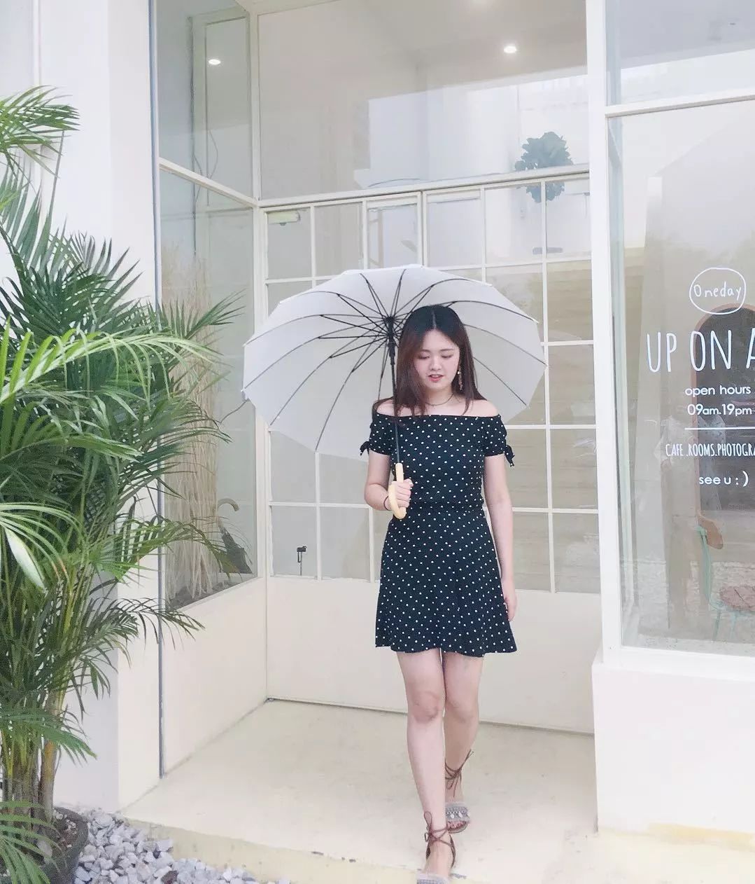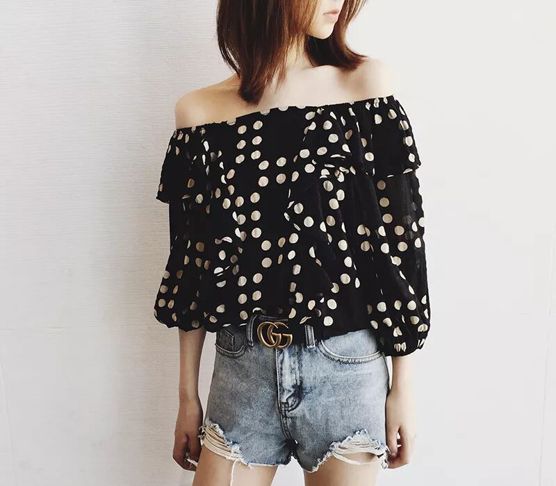 黑底白波点一字肩上衣