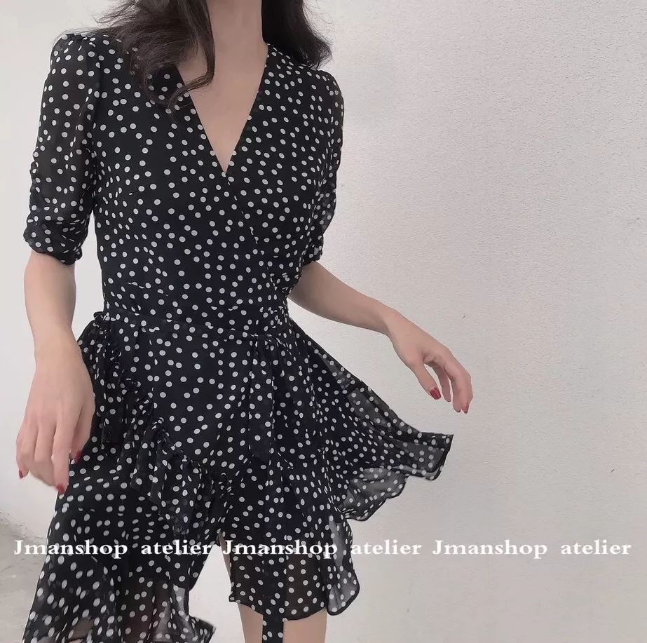 黑底白波点V领雪纺连衣裙