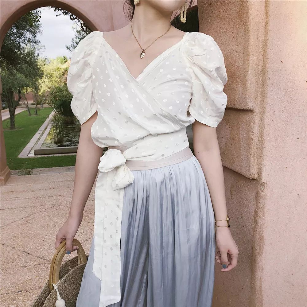 白波点V领复古短款上衣