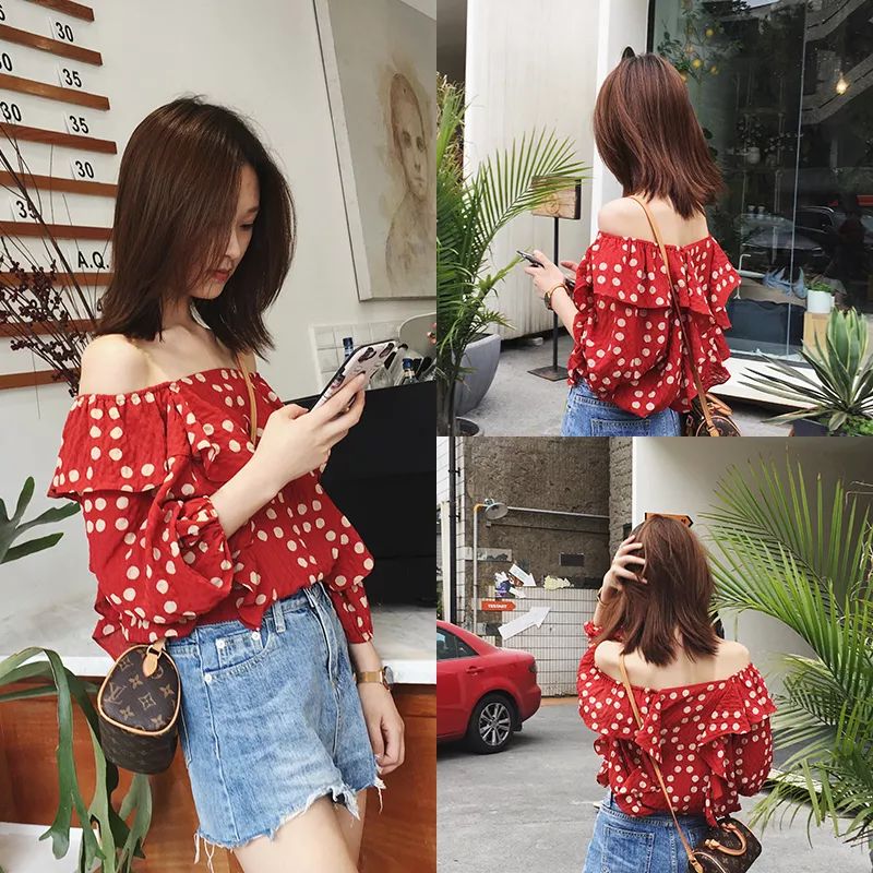 红底白波点一字肩上衣
