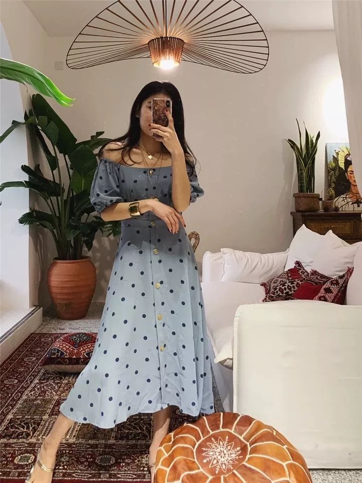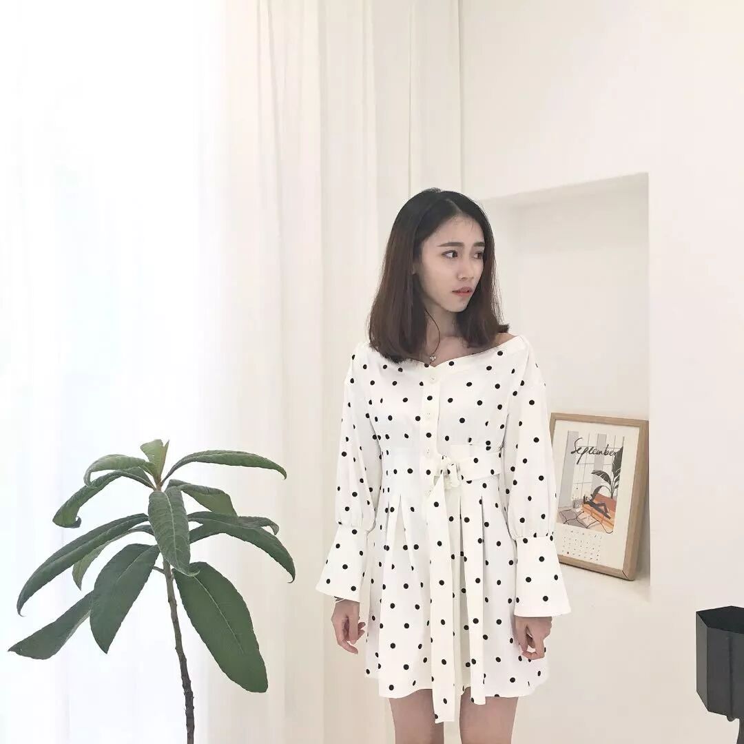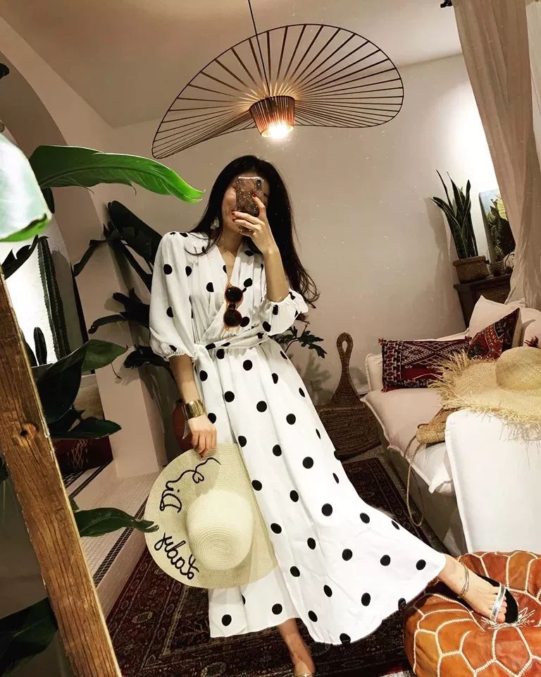 稀疏的大波点更日常百搭,白底大波点令整件衣服看上去更显大气,裙装会比较成熟稳重,更加有女人味。