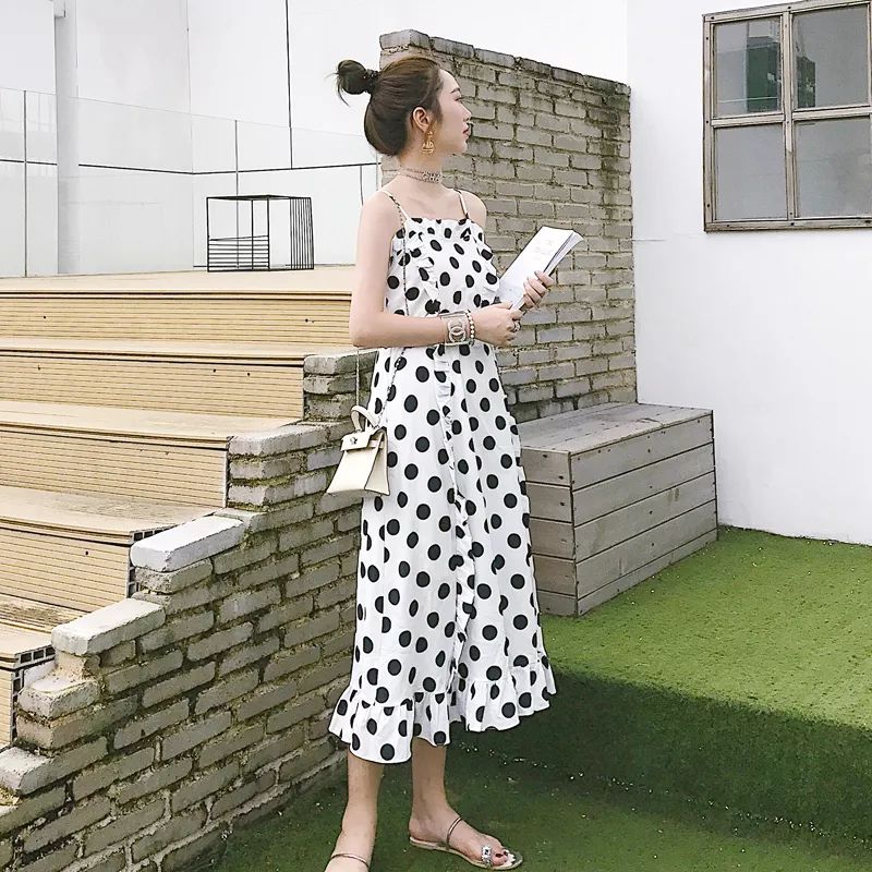 白底黑波点吊带连衣裙