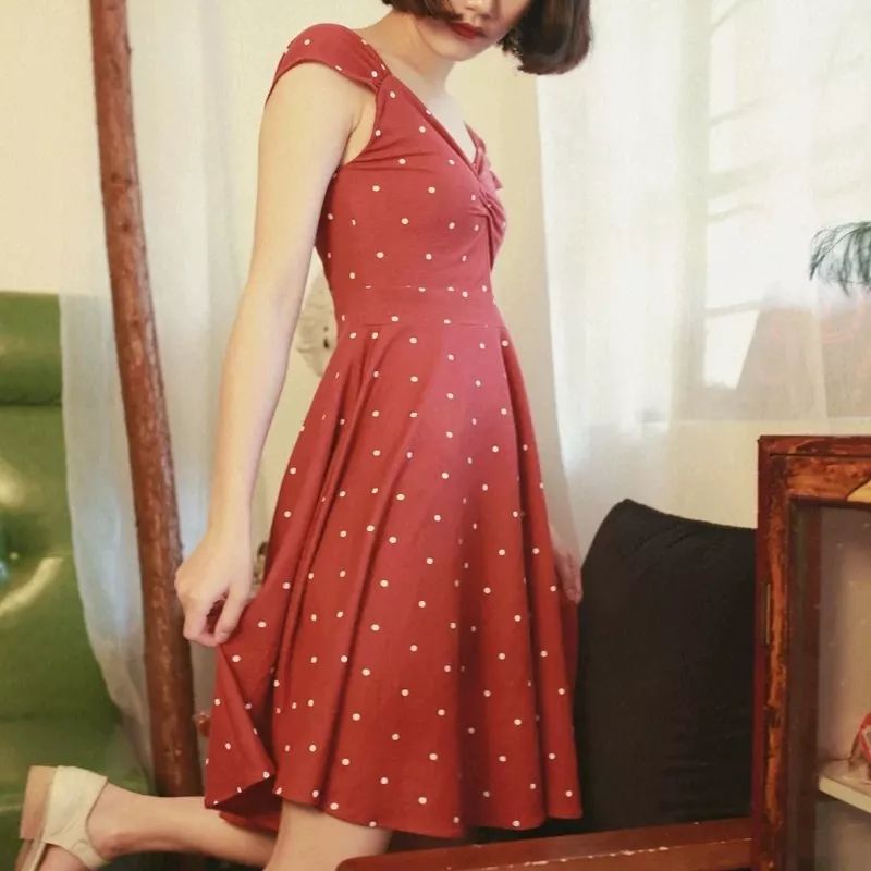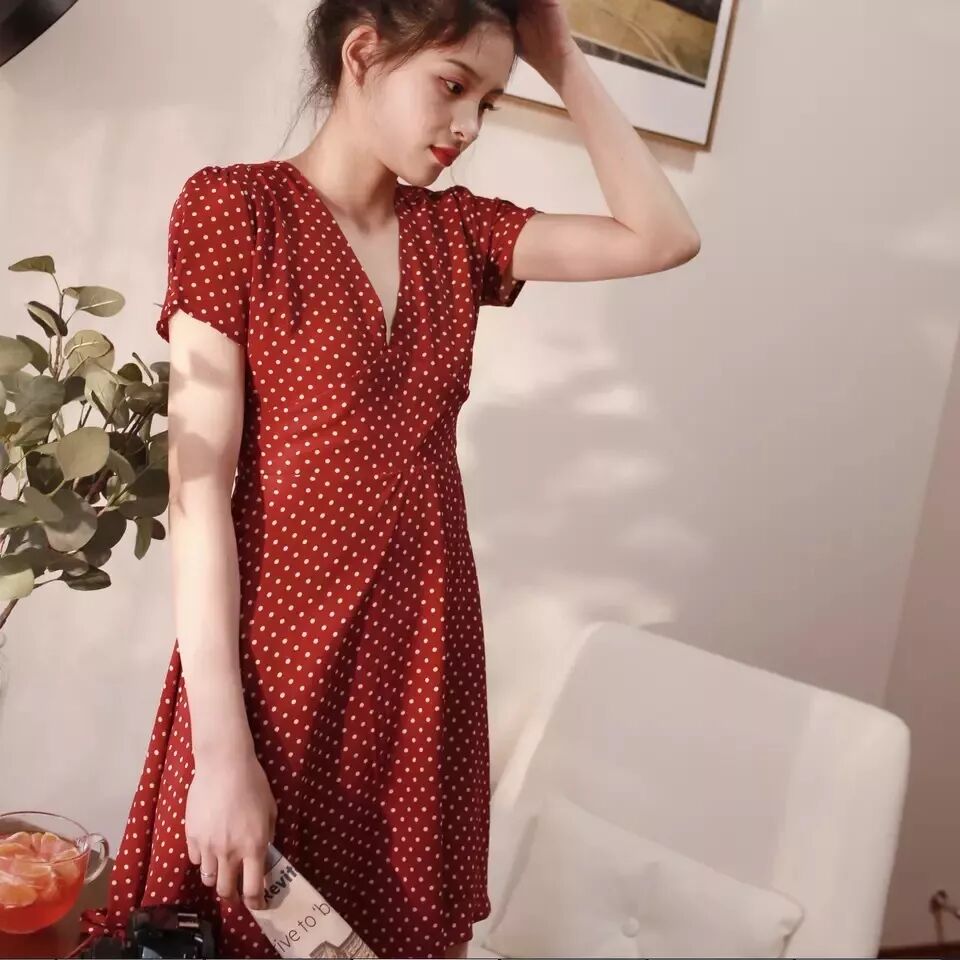 红底白波点V领连衣裙