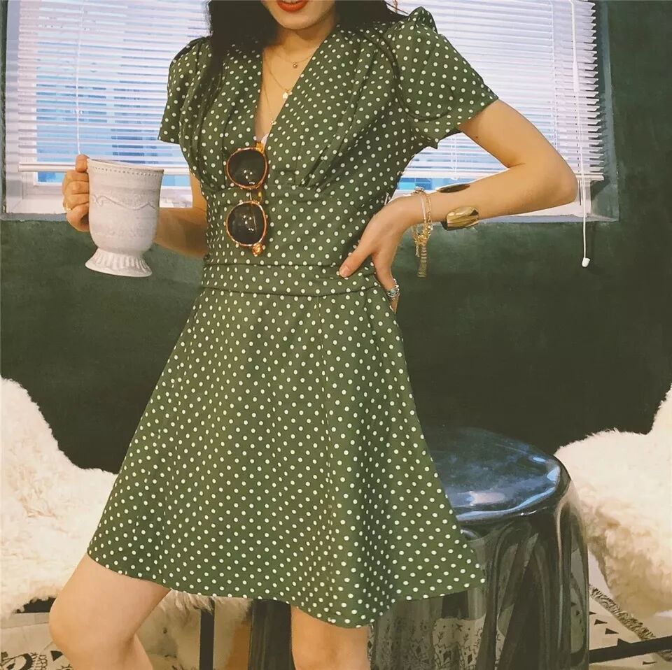 绿底白波点V领连衣裙