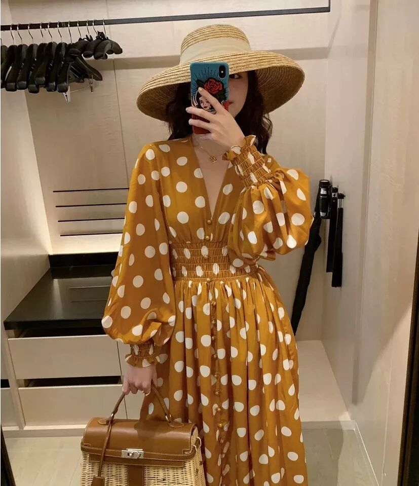 黄底白波点V领度假风连衣裙