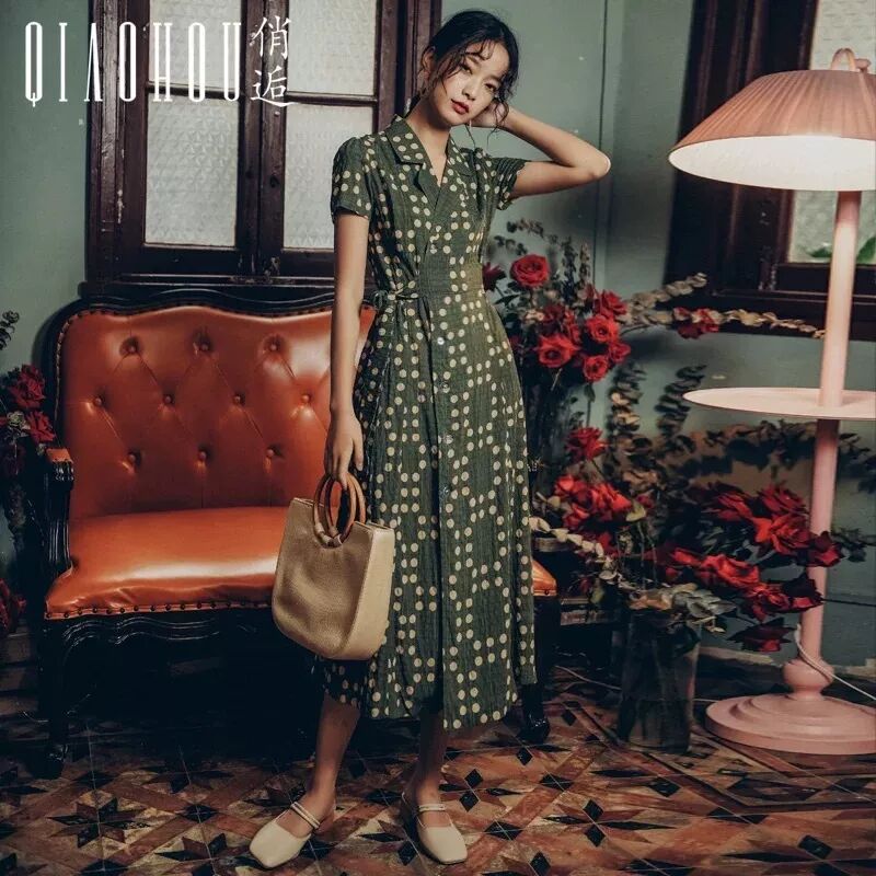 绿波点棉质复古连衣裙