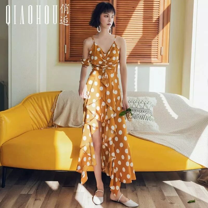 黄底白波点吊带连衣裙