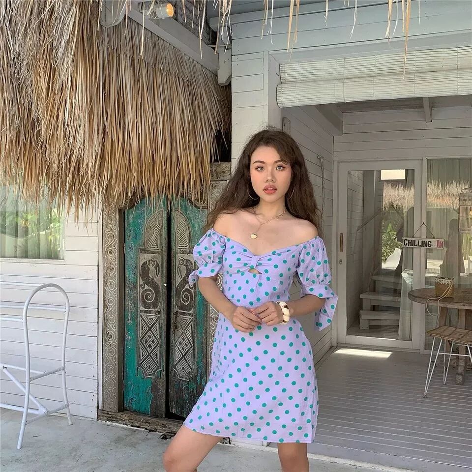 紫底绿波点一字肩连衣裙