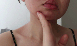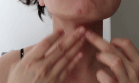 用手指轻轻按压下巴位置,向后拉至耳垂下,再顺着肩颈,滑向锁骨位置。
