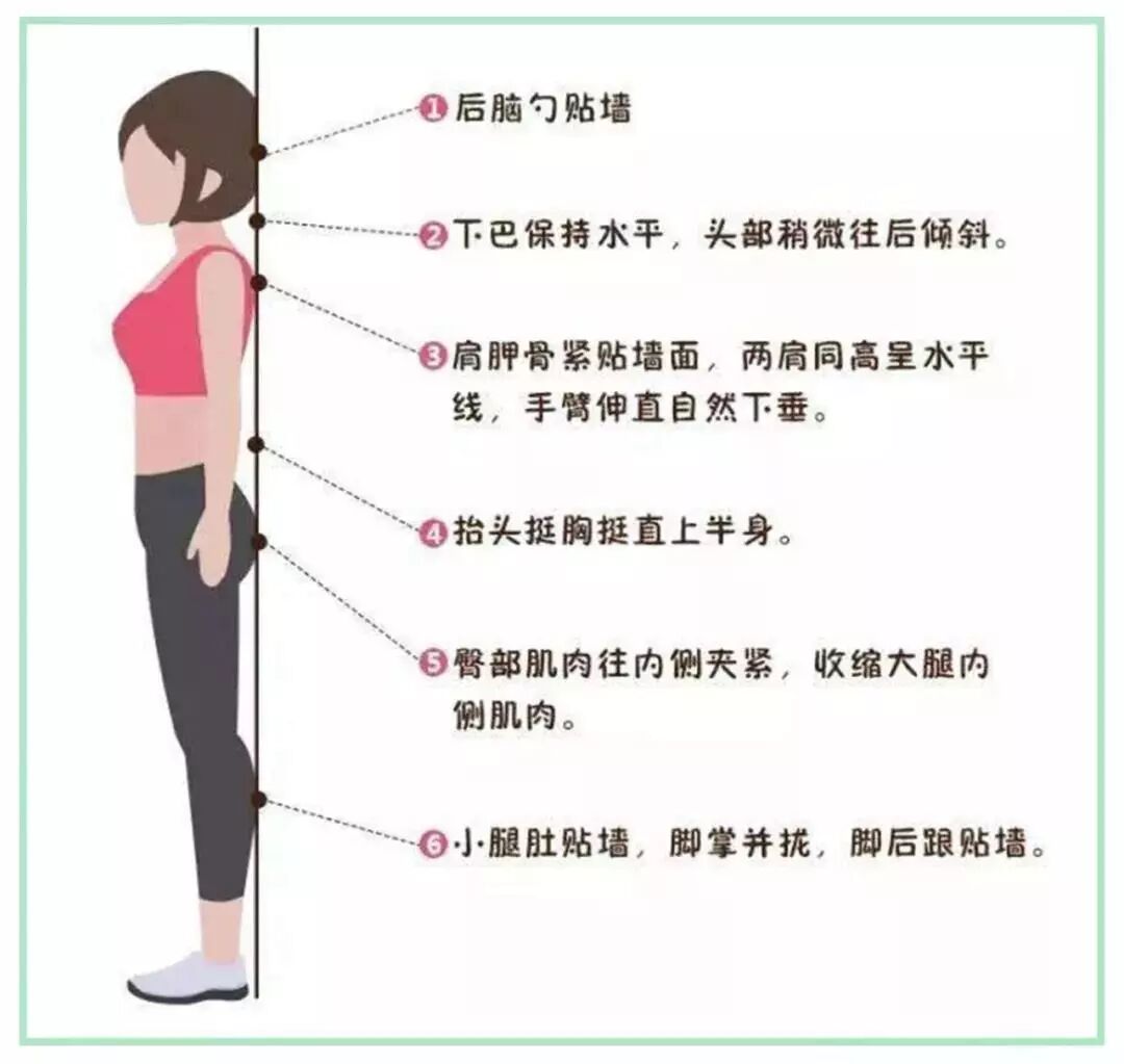 贴墙站的时候注意了,脚跟、屁股、肩膀、后脑勺都要贴紧墙壁。