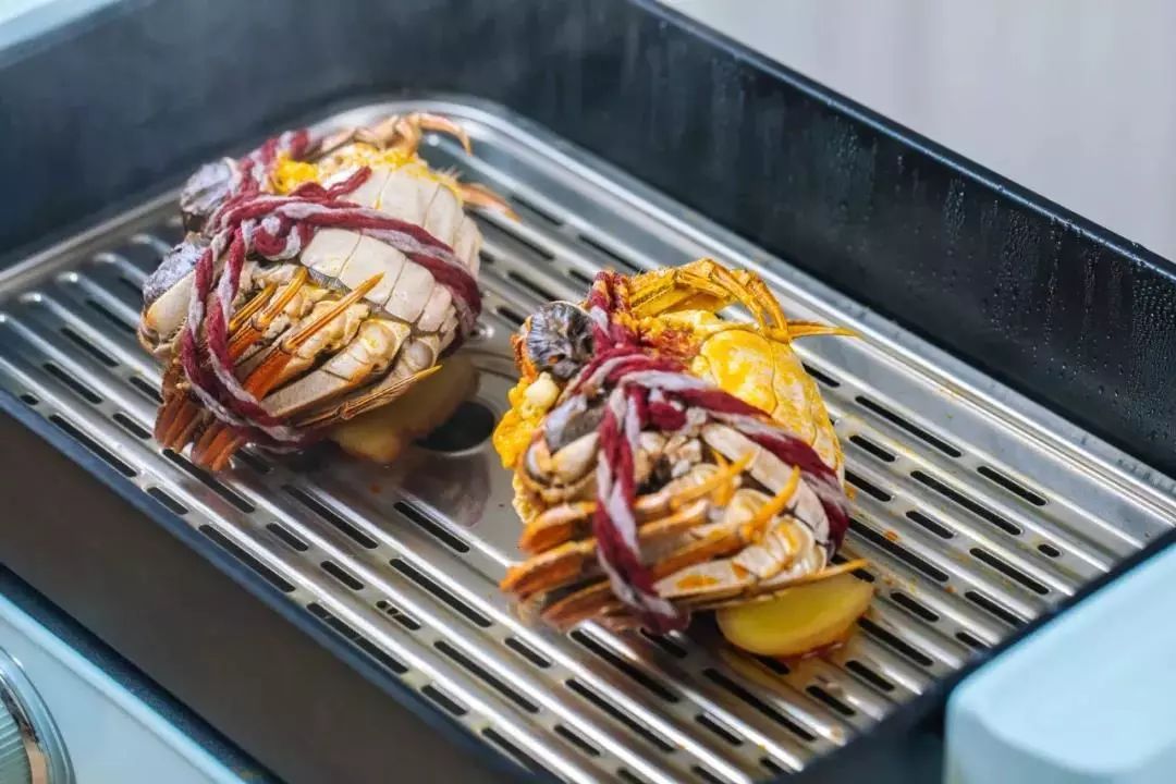 6.记住一定要将大闸蟹腹部朝上摆放,否则蟹黄有可能会流光的。