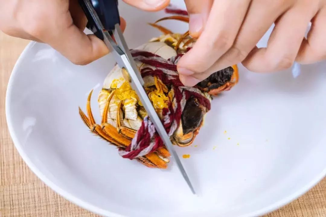 7. 接下来我们开始拆蟹。这时候剪开五花大绑,就不会遇到反抗了。