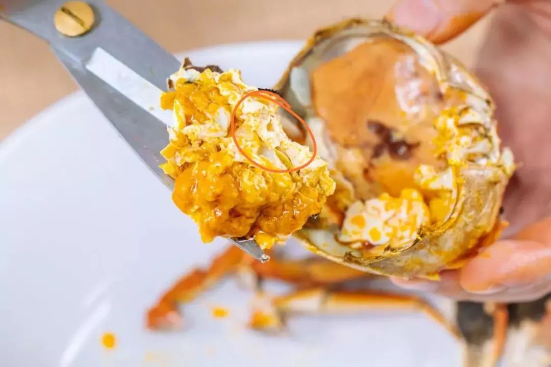 12. 蟹壳上靠近眼睛的部位,里面有蟹胃(画圈的白色部分),也要取掉,不能吃。