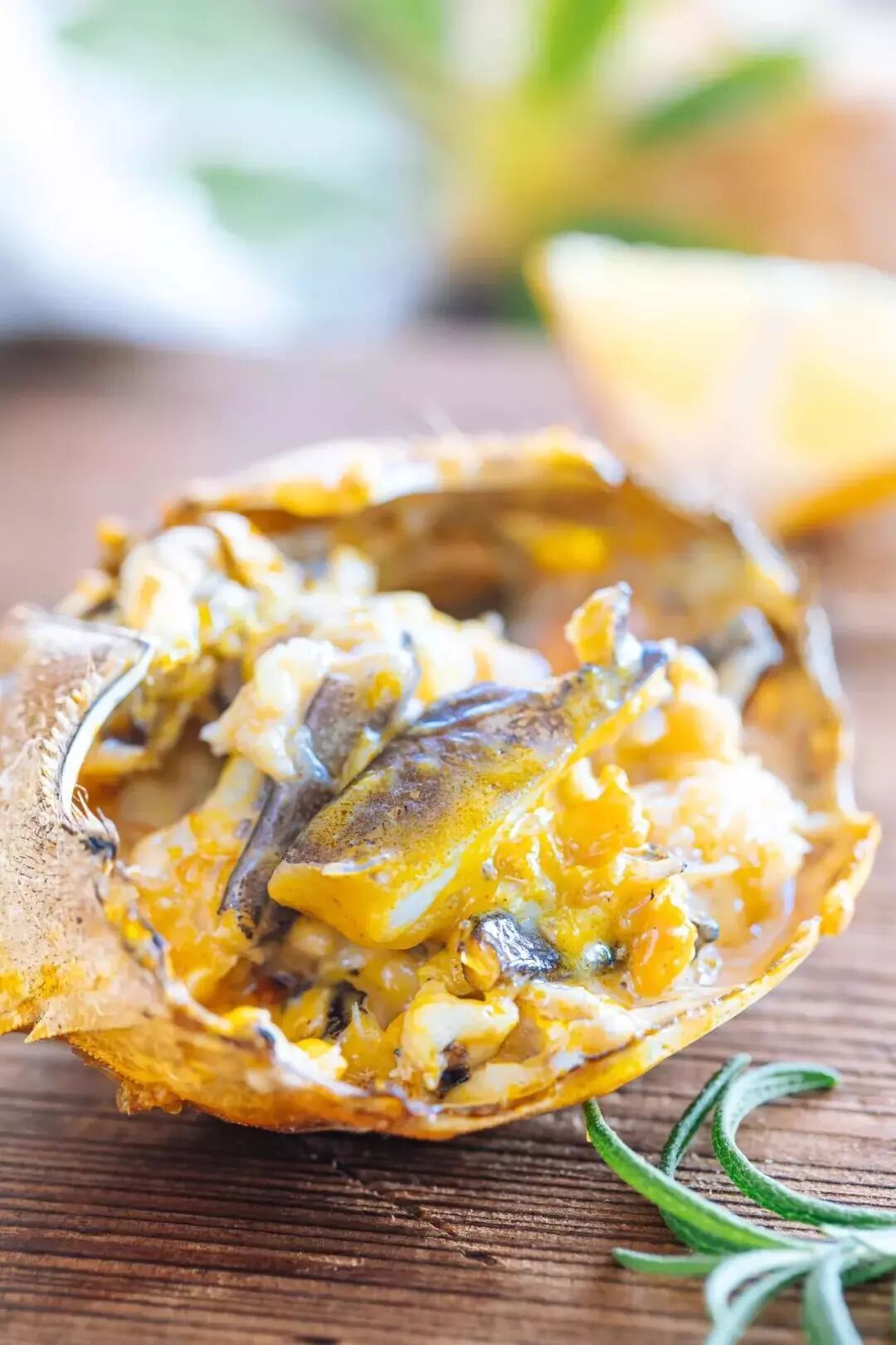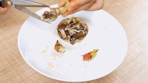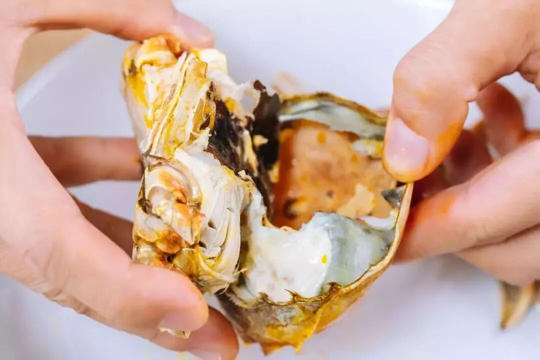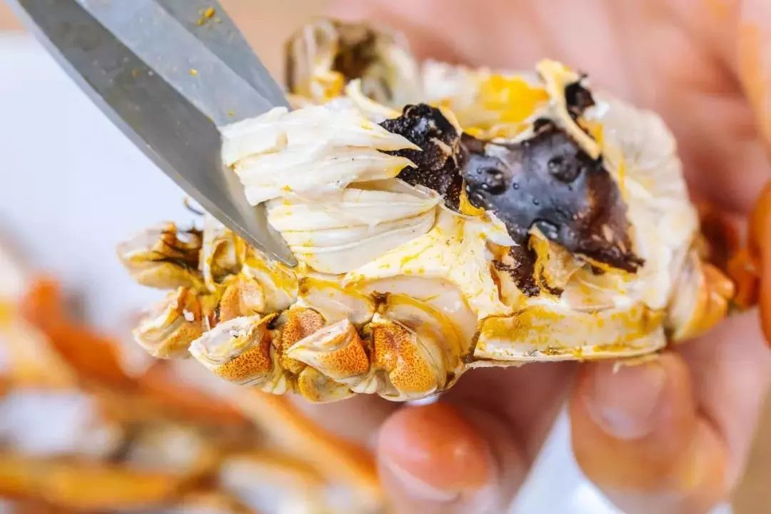 11. 然后掀开蟹壳,蟹壳上黑色的膜也是不能吃的,要处理掉。