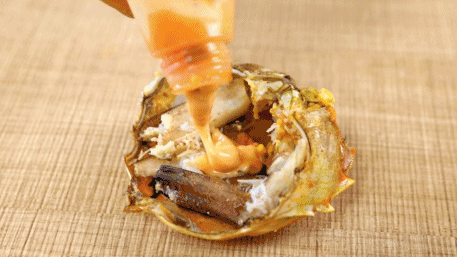 21.此时如果你要正经吃蟹,把刚才掏出来的这些肉沾点醋就可以开始享受了。但小主决定用不正经的方式来吃蟹。我们在装满蟹肉的蟹斗上,挤上5g千岛酱。