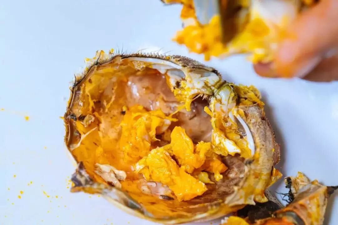 14. 现在我们可以把蟹身里的黄掏出来,放入蟹斗中。