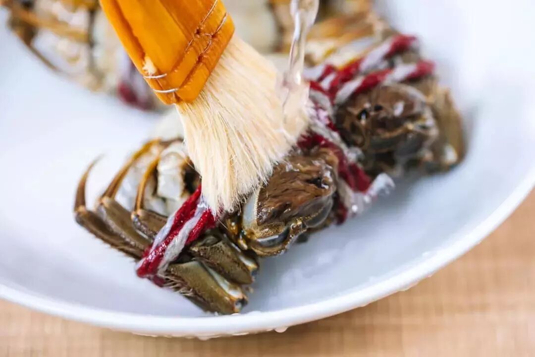 2. 接着清水冲洗,用毛刷清理大闸蟹身体,记得千万不要给大闸蟹松绑,否则就是自找麻烦啦。