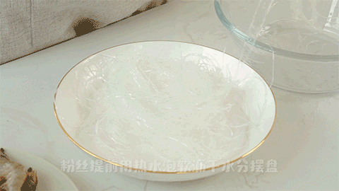 3. 粉丝沥干水分摆盘,中央盘起小山状,把处理好的虾整齐地摆上去