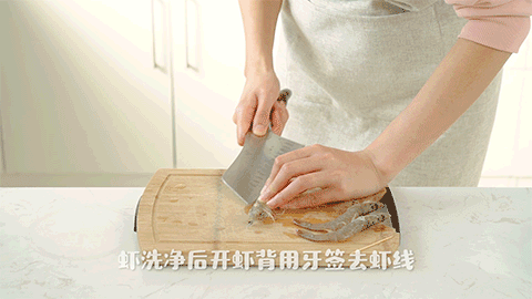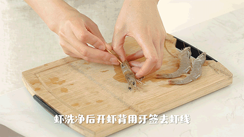 2. 虾洗净后用剪刀剪掉头上的长须,再开虾背,用牙签或镊子挑去虾线