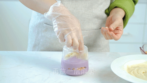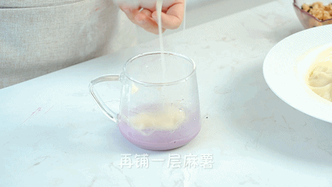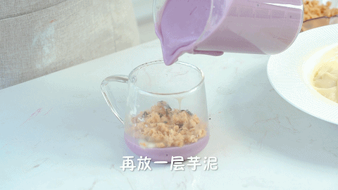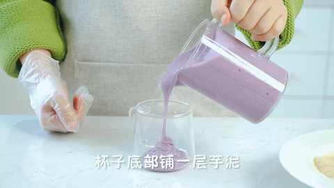 13、取一个干净的杯子,在杯子底部铺一层芋泥