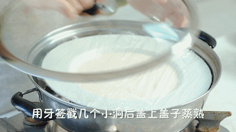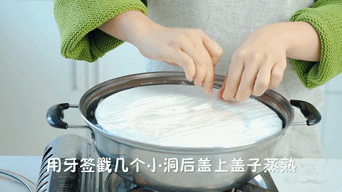 8、用牙签在保鲜膜上戳几个小洞,盖上盖子蒸20分钟
