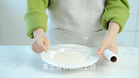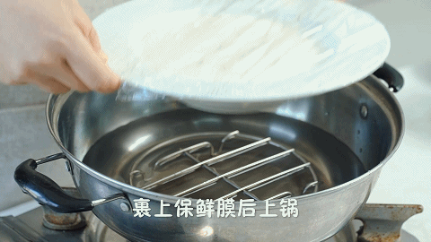 7、裹上保鲜膜后放在锅里