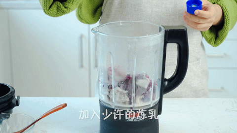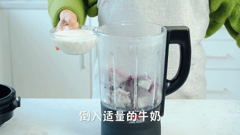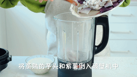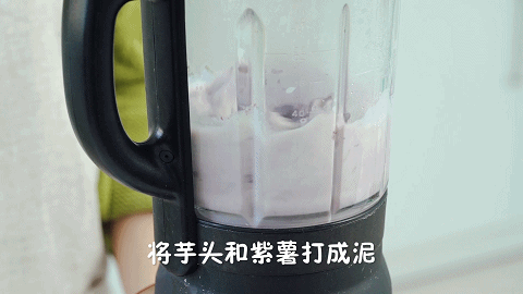 9、这时我们做芋泥:将蒸好的芋头和紫薯倒入破壁机中