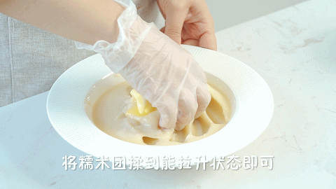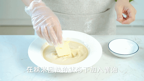 12、待糯米团稍许凉之后,带上手套将20克黄油均匀地揉进面团中,揉到能拉升状态,麻薯就做好了