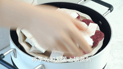 3、将300克芋头和100克紫薯放入锅中蒸熟