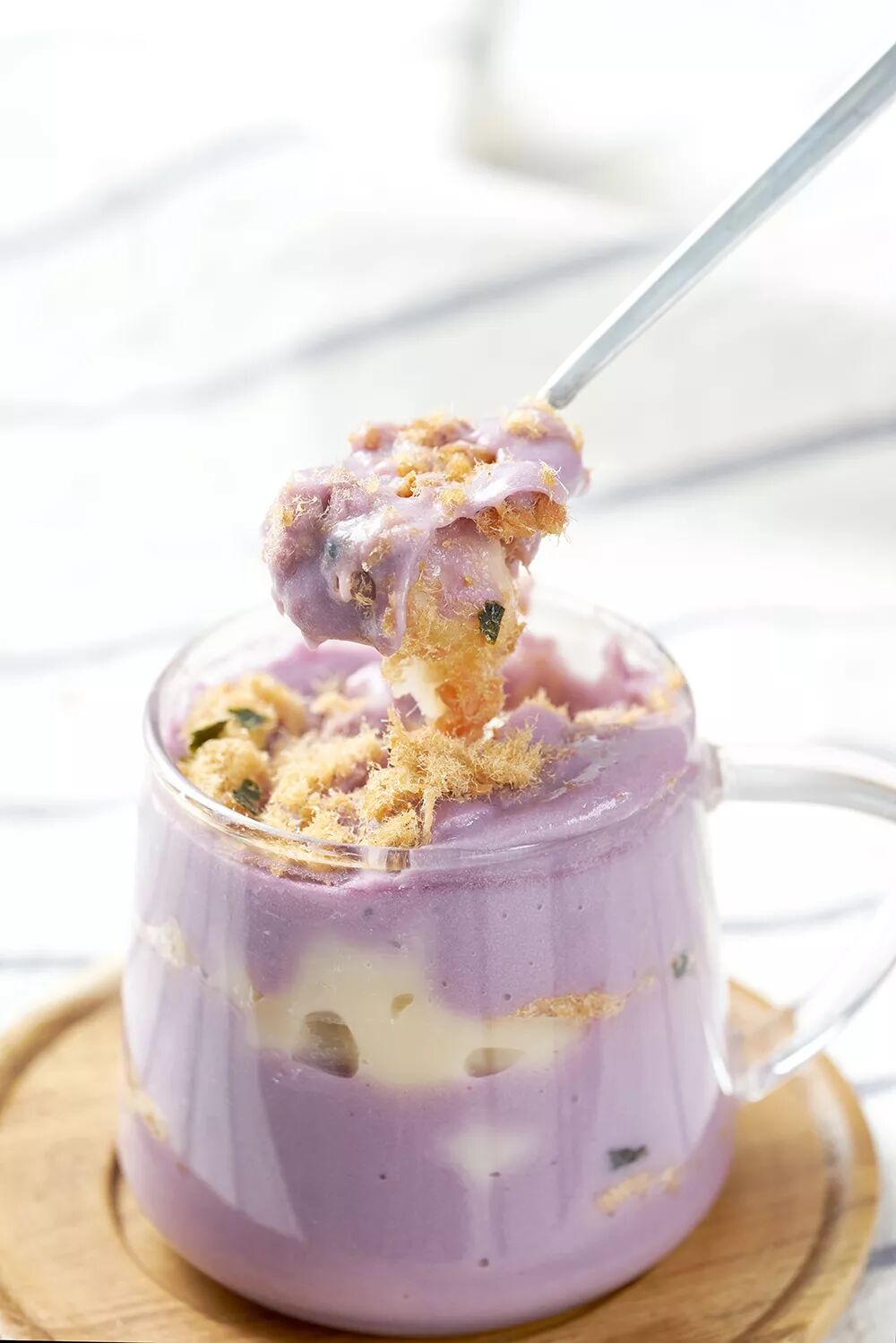 小小胖胖的身体,料却不少!软糯的芋泥,Q弹的麻薯,酥脆的肉松,在杯子里层层堆叠,层次分明却又交相辉映。