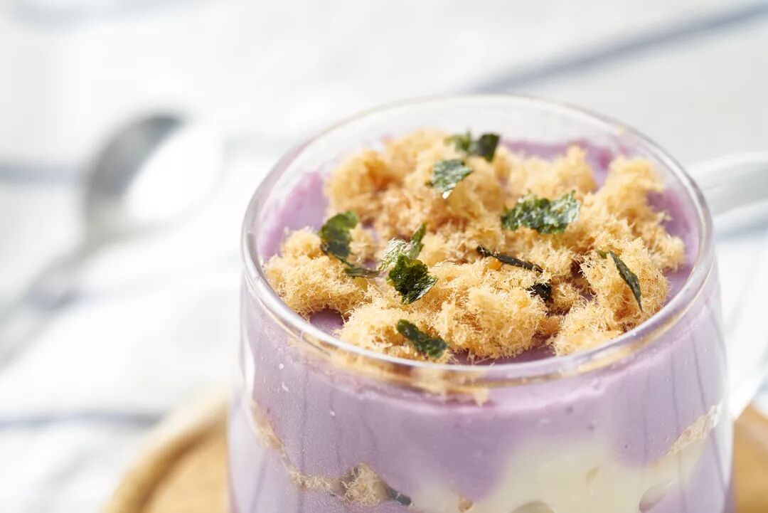 香浓的芋泥,搭配糯叽叽的麻薯,再加上香软的肉松,真是神仙美味,颜值也高,一杯吃完超满足!