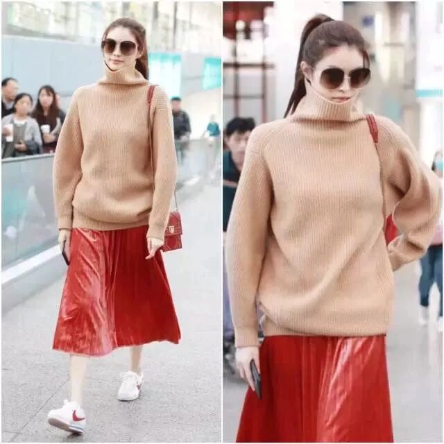 仙姑的驼色系毛衣+红色漆皮百褶长裙,皮革的亮泽度让整体质感提升了不止一个level,红红火火的颜色真的太符合过年的气息了!外加仙姑勇敢的露出了脚踝,拉高身型又显瘦的,怪不能能被抓拍的这么美呢~