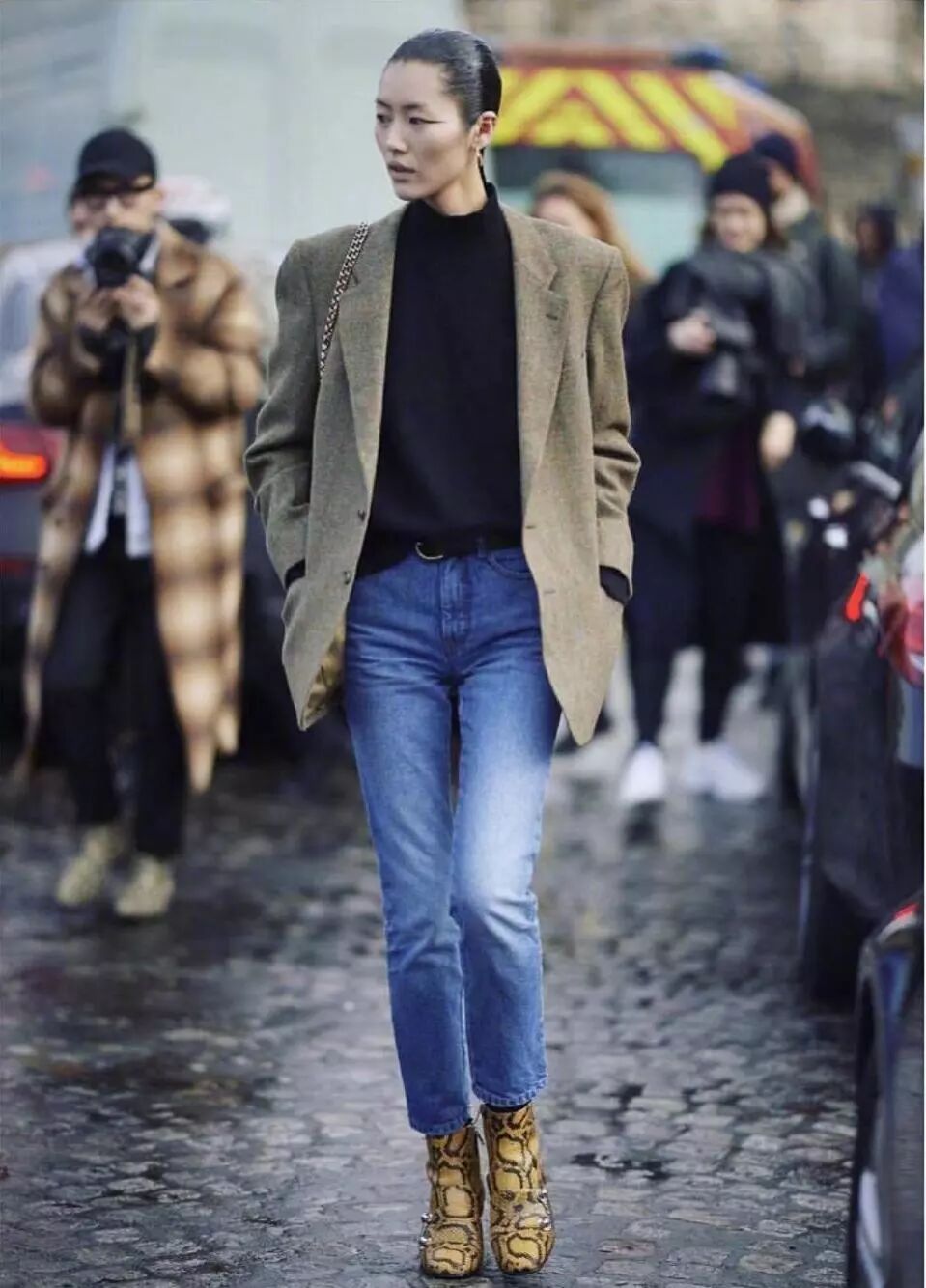 Bella每次的街拍都是行走的教科书啊,高腰的牛仔裤+短款的高领毛衣,完美诠释出了最美休闲装。这样的穿搭对矮个子的身材非常友好,让你看起来又高又瘦~保证不会出错。
