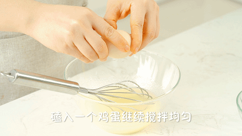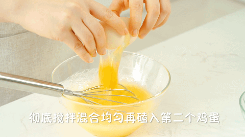 6、磕入1个鸡蛋继续搅拌均匀,彻底搅拌混合均匀后,再磕入第2个鸡蛋搅拌均匀