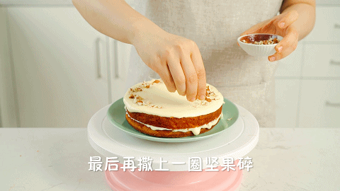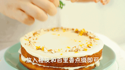 想要蛋糕好看,最后还需要淋上一层奶油芝士霜,然后撒上坚果和橙皮作为装饰,简直就是仙气十足啊~