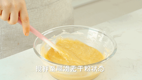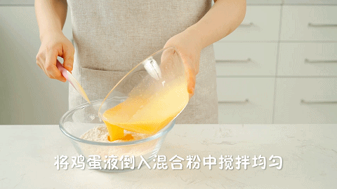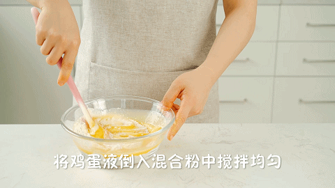 7、将鸡蛋液倒入步骤4的混合粉中搅拌均匀,搅拌均匀至顺滑