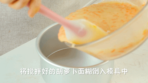 10、拌好的胡萝卜面糊倒入模具中