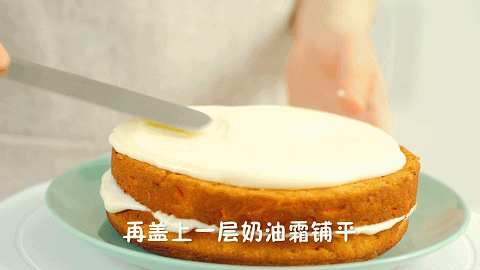 15、先抹一层奶油霜,铺平,再盖上另一片蛋糕