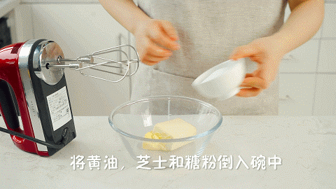 12、开始制作奶油芝士霜:将软化好的25克黄油、100克奶油奶酪、100克糖粉倒入碗中搅打均匀