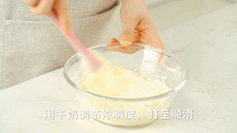 13、用牛奶调节浓稠度,打至顺滑,有些微的流动性就可以了